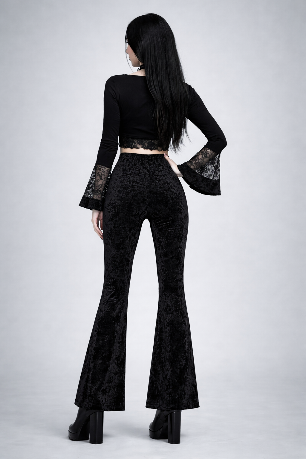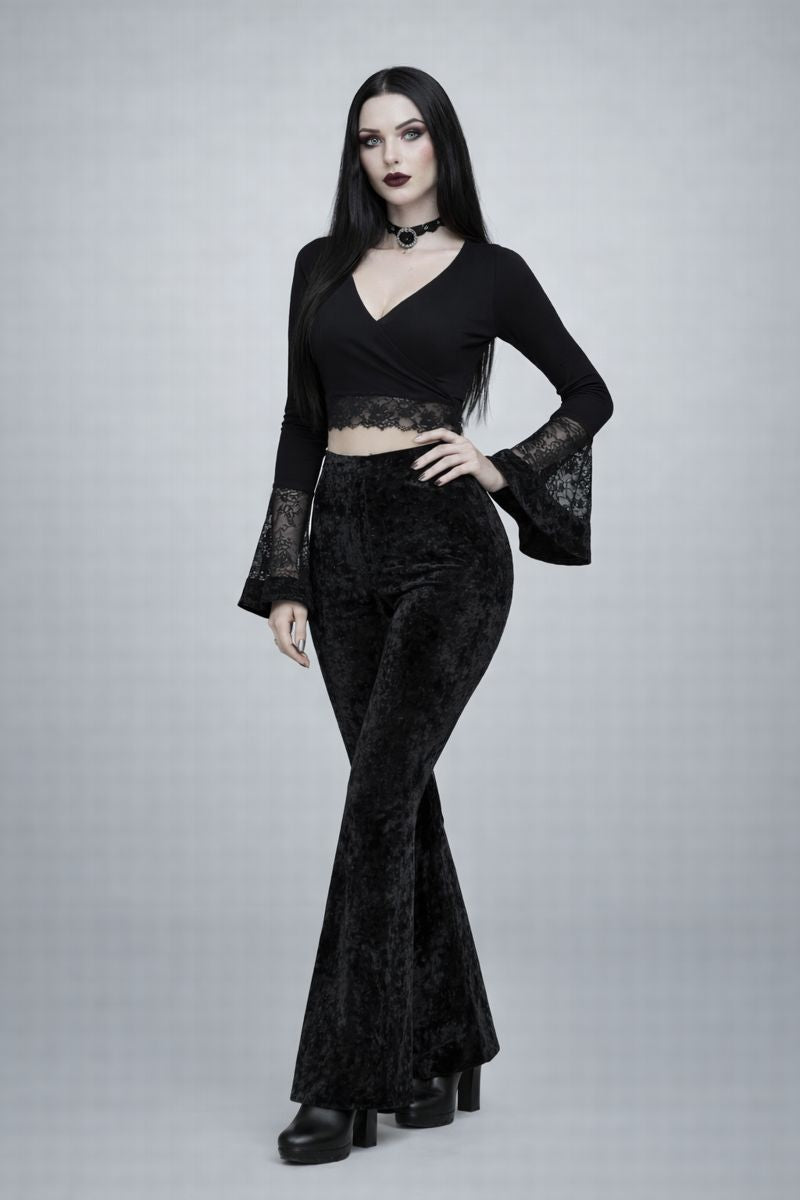 Soft, sleek, and effortlessly flattering, these high-waist velvet bootcut pants bring a refined edge to everyday alternative styling. Designed with a sculpting fit through the hips and thighs, they open into a subtle bootcut flare that elongates the legs and balances proportions.