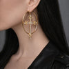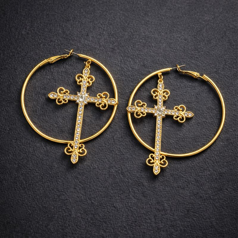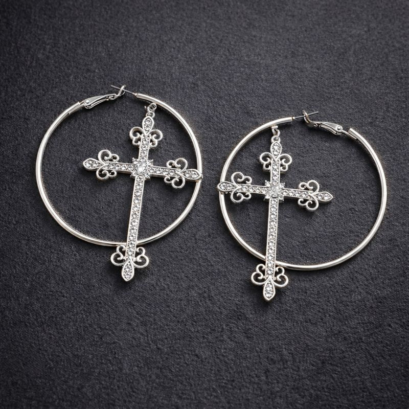 A luminous symbol suspended in motion. These cross halo earrings feature a sculpted cross framed within a circular hoop, fully set with diamond-style detailing for a sharp yet elegant finish. Designed to catch the light while holding a dark, ritual-inspired edge, they elevate both minimal and statement looks.