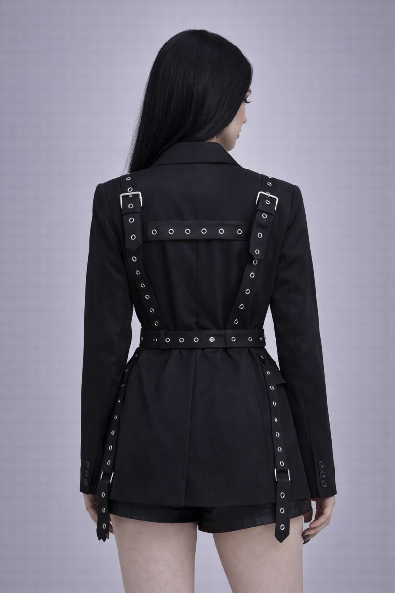 Sharp and refined with a bold edge, this tailored suit jacket blends structured tailoring with subtle punk-inspired details. Designed with decorative rivet buckles and three-dimensional accents, it delivers a confident silhouette that feels both powerful and modern.
