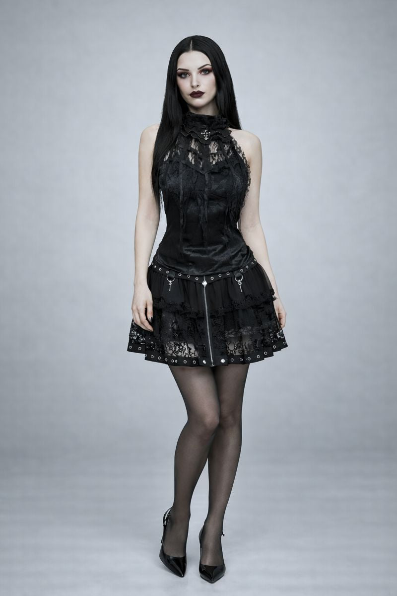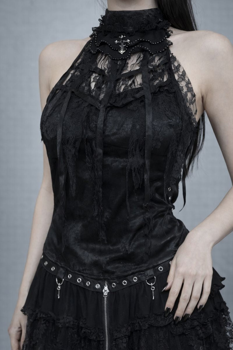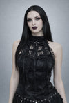Delicate, dark, and quietly powerful. This lace halter top weaves floral and cobweb-inspired textures into a sheer silhouette designed for layering and night ritual. Finished with a soft rose bow detail, it balances romance and darkness — subtle, sensual, and intentional.