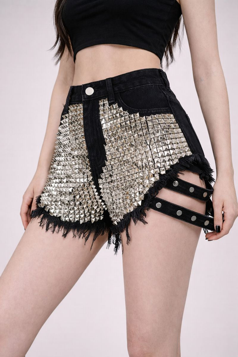 Bold and unapologetically punk, these high-waist denim shorts are designed to stand out through texture and attitude. The structured silhouette is elevated by heavy metal stud detailing across the front panels, creating a powerful contrast against the washed black denim.