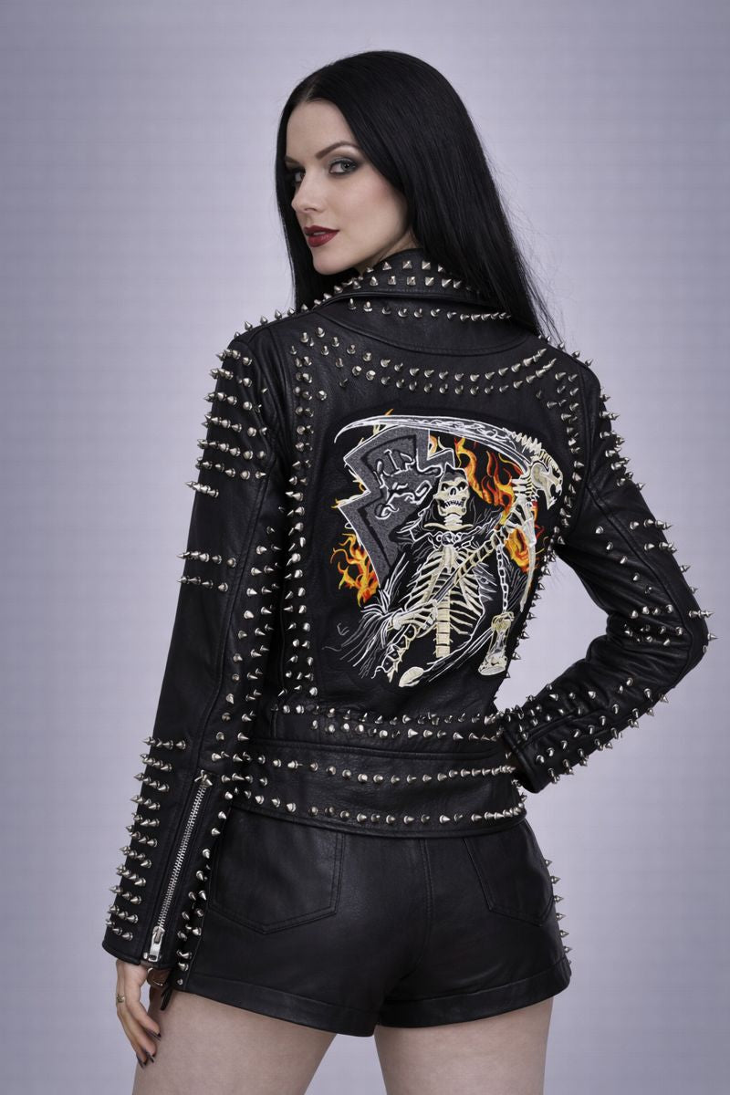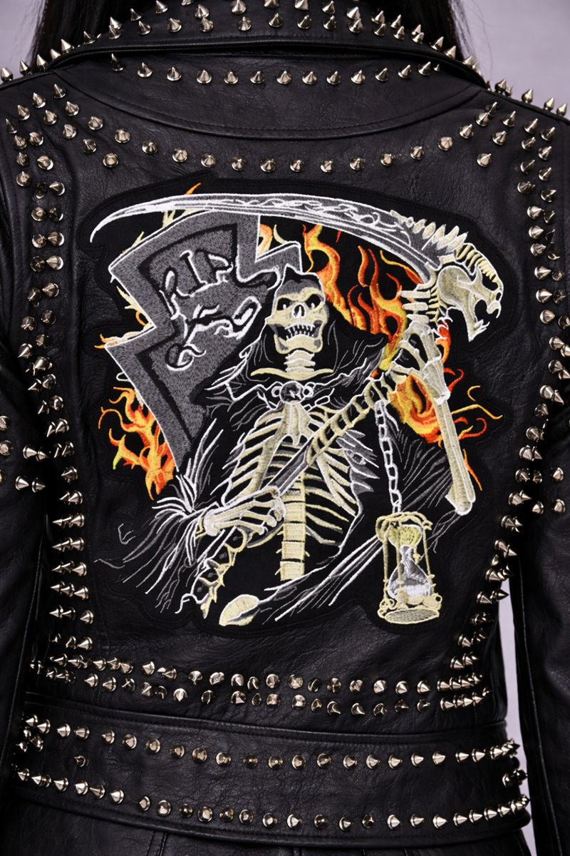 Crafted from PU faux leather, the jacket features a striking graphic design on the back, depicting a grim reaper-inspired motif surrounded by flames. This back artwork adds depth and character, transforming the piece from a classic biker silhouette into a true statement outerwear essential.