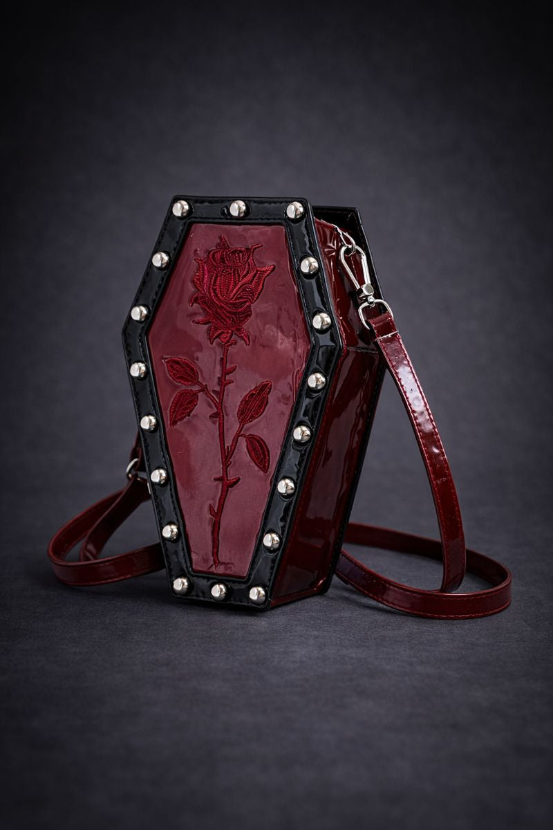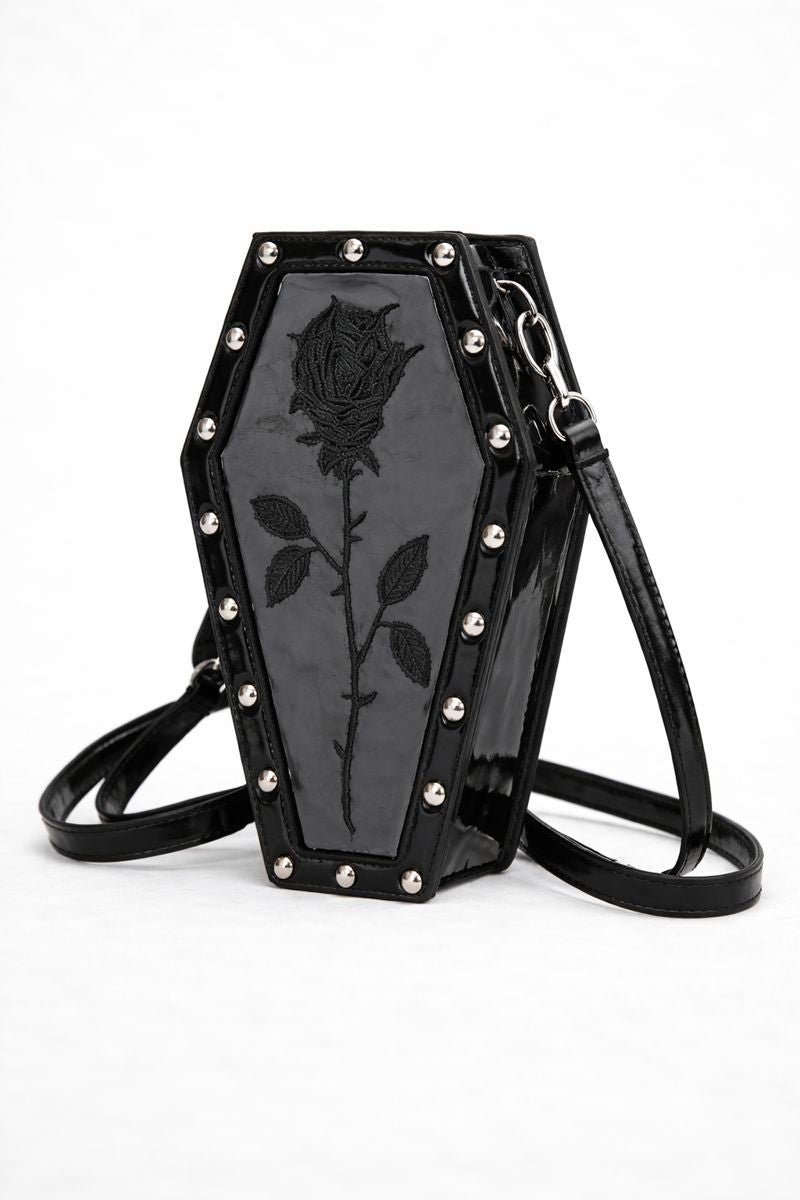 A gothic-inspired coffin-shaped shoulder bag designed to make a bold statement. Featuring embroidered rose detailing, metallic stud accents, and a structured silhouette, this piece blends dark romanticism with modern alternative fashion.