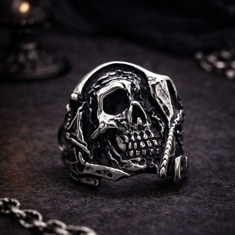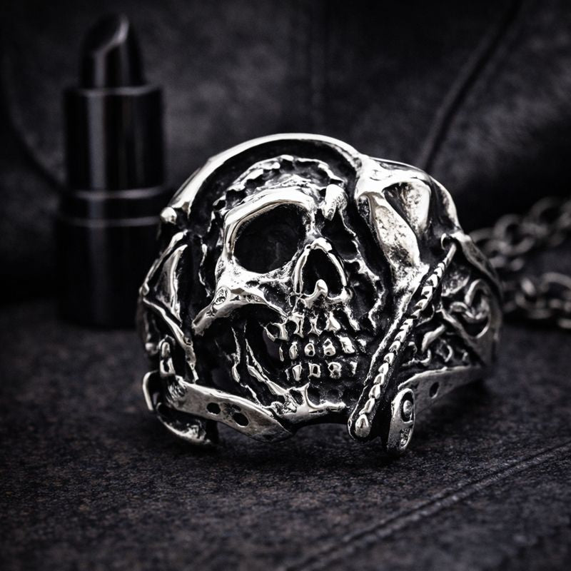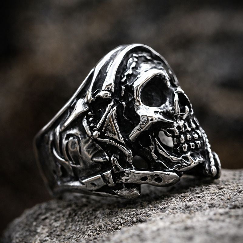 A raw symbol of rebellion cast in metal. This silver skull ring features an aggressively sculpted design with deep relief and distressed detailing, giving it a brutal, worn-in presence. Dark, unapologetic, and deliberately bold, it’s a statement piece designed to anchor the hand with attitude — built for those who wear their edge openly.
