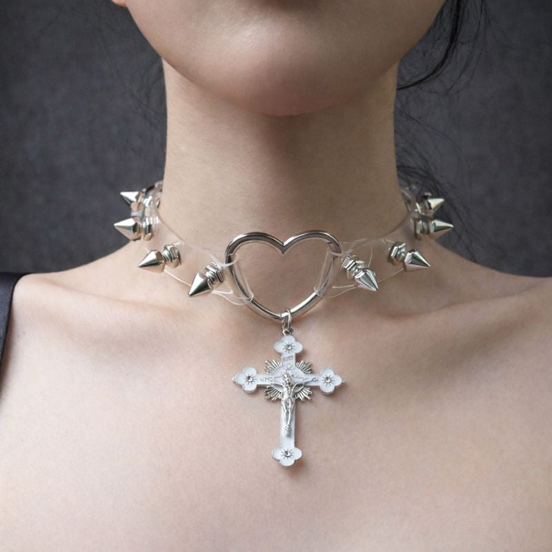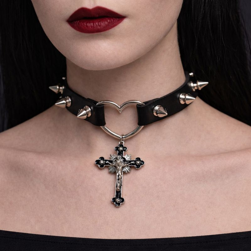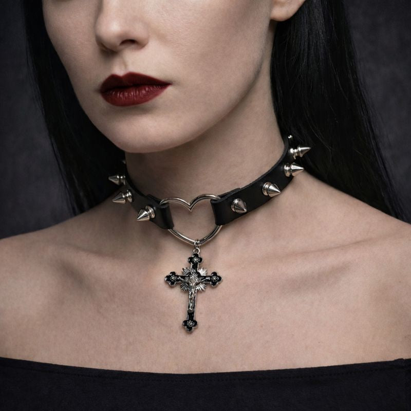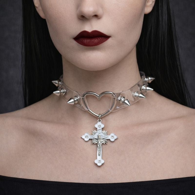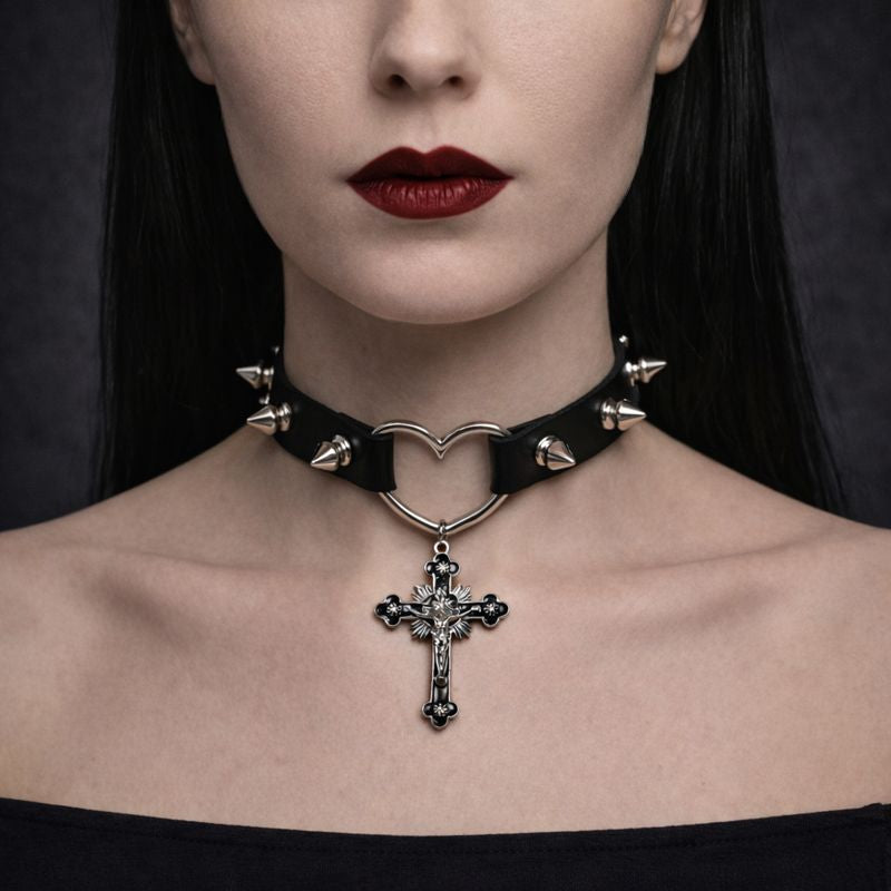 A striking collision of softness and aggression. This choker features sharp metal spikes set against a sleek collar, finished with a heart-shaped ring and a suspended gothic cross. Designed to sit close to the neck, it frames the collarbones with intention — seductive, defiant, and unapologetically bold.