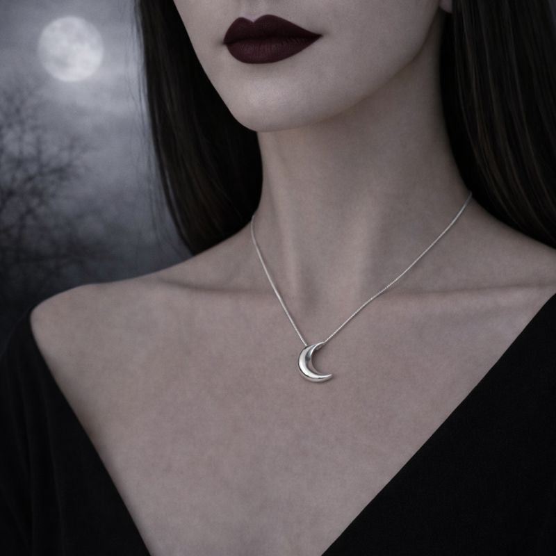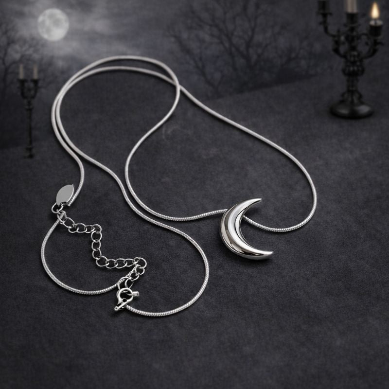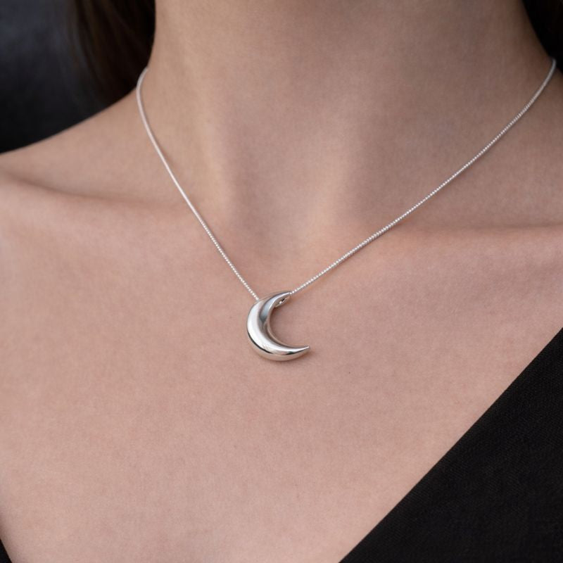 A quiet celestial symbol designed to rest close to the skin. This glossy crescent moon necklace is crafted in 925 sterling silver and suspended from a sleek snake chain, creating a clean, fluid silhouette. Minimal yet evocative, it brings a subtle night energy — refined, intimate, and effortlessly modern.