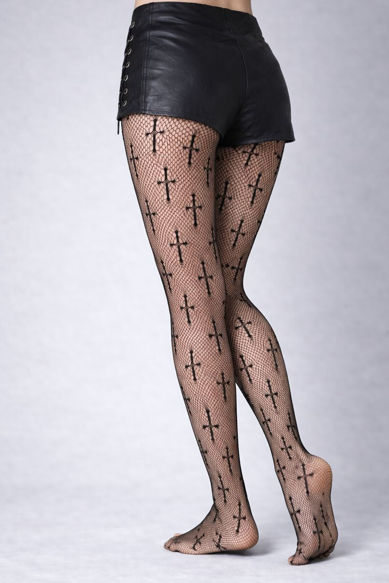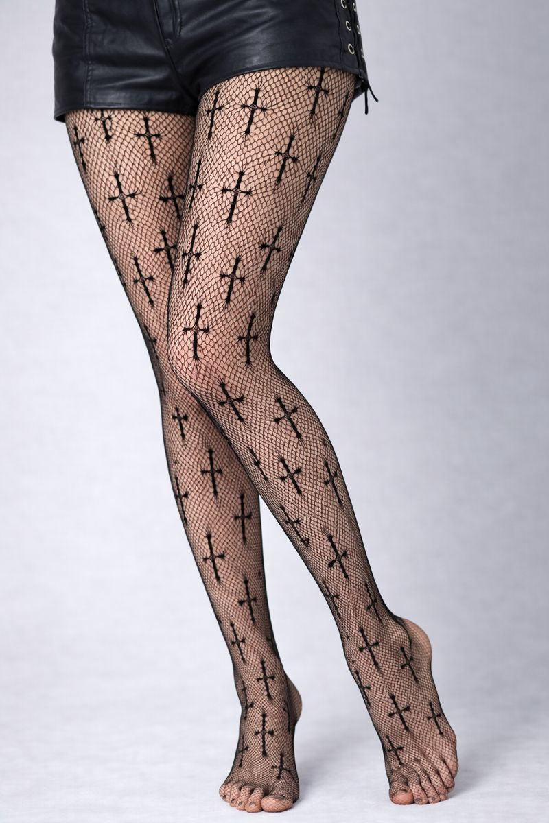 A dark classic reworked for after-hours silhouettes. These fishnet tights feature an all-over gothic cross pattern woven into sheer black mesh, creating a striking contrast between structure and exposure. Graphic, provocative, and unapologetically bold — designed to anchor nightwear looks with attitude and intent.