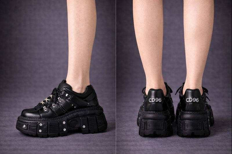Bold and unapologetic, these gothic platform shoes are designed to elevate both height and attitude. Featuring a chunky sole with metal rivet detailing and layered strap accents, they bring a strong punk energy with a modern underground edge.