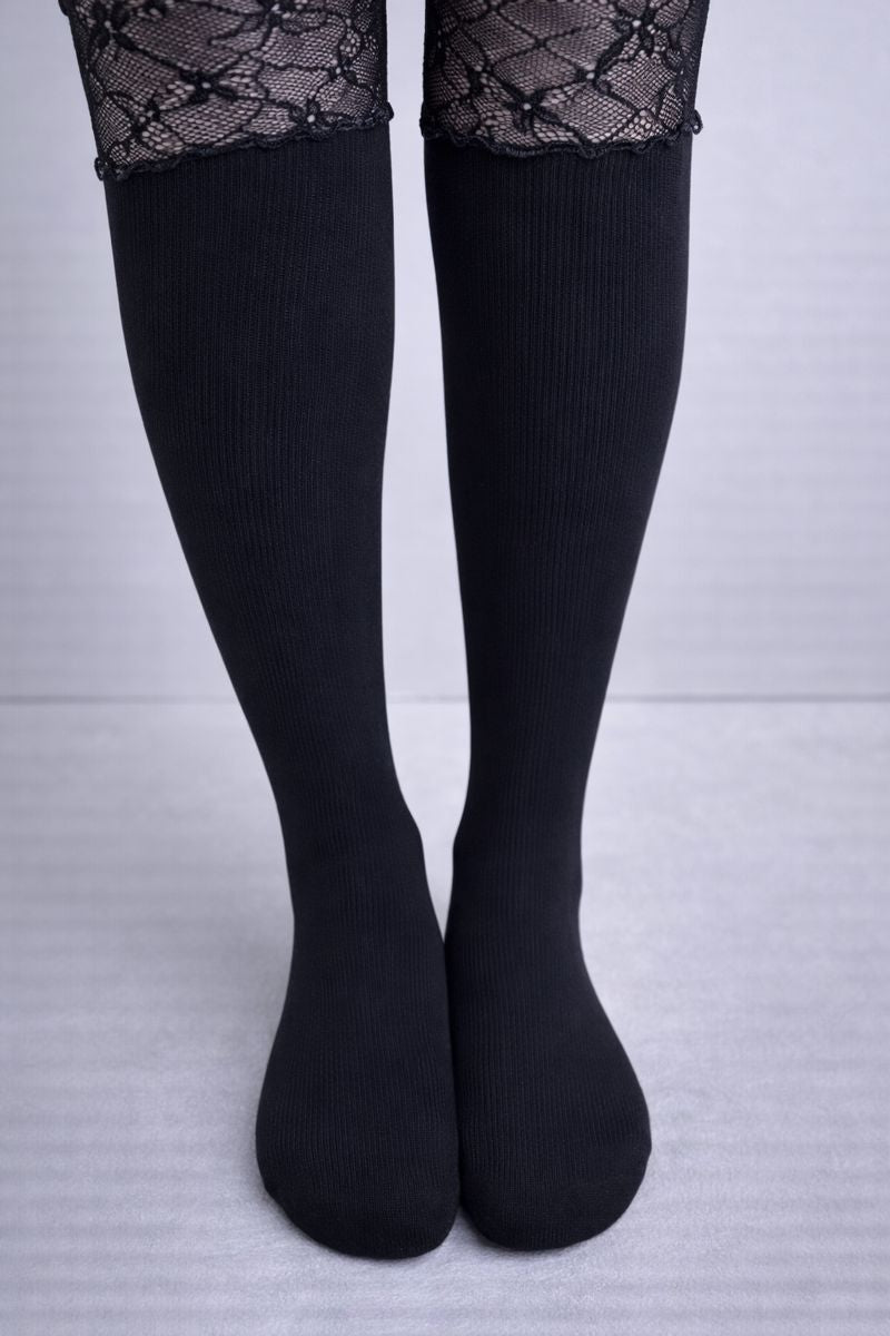 A dark reinterpretation of a classic silhouette, these knee socks play with contrast and texture. Opaque black cotton meets delicate lace panels to create a subtle reveal that feels soft, sensual, and quietly provocative. Designed to elevate everyday looks with a refined gothic edge, they blur the line between innocence and intention.