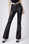 The standout detail is the black lace panel finish at the lower leg, revealed through slit-style openings for a dark, sensual contrast against the glossy PU leather. Finished with metal buckle accents, this piece balances underground attitude with a refined, fashion-forward feel.