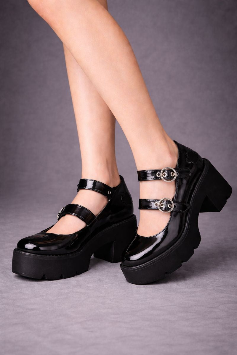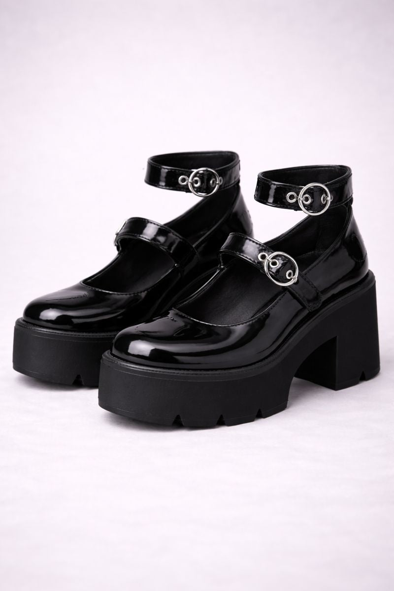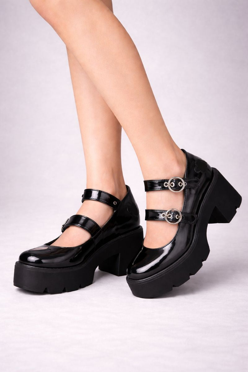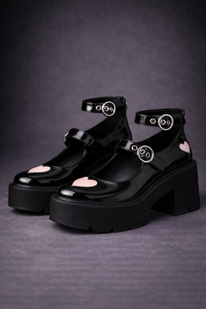 Playful yet bold, these platform Mary Jane shoes blend a classic British-inspired silhouette with a rebellious twist. The rounded toe and chunky platform create a soft yet striking shape, while metal buckles and heart details add a subtle statement edge.