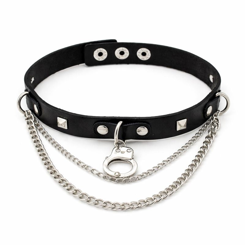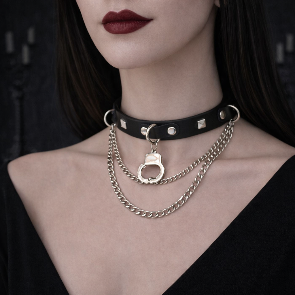A sharp collision of restraint and rebellion. This choker features a sleek faux leather band finished with metal studs, layered chains, and a bold central handcuff detail. Sitting close to the neck, it brings a confrontational edge to punk and street-inspired silhouettes — unapologetic, graphic, and designed to be seen.