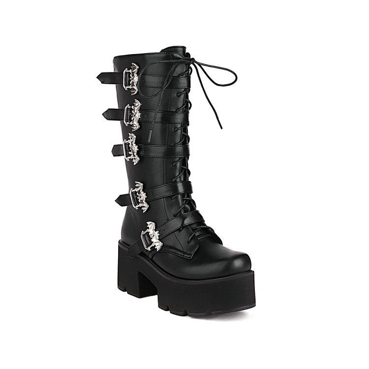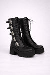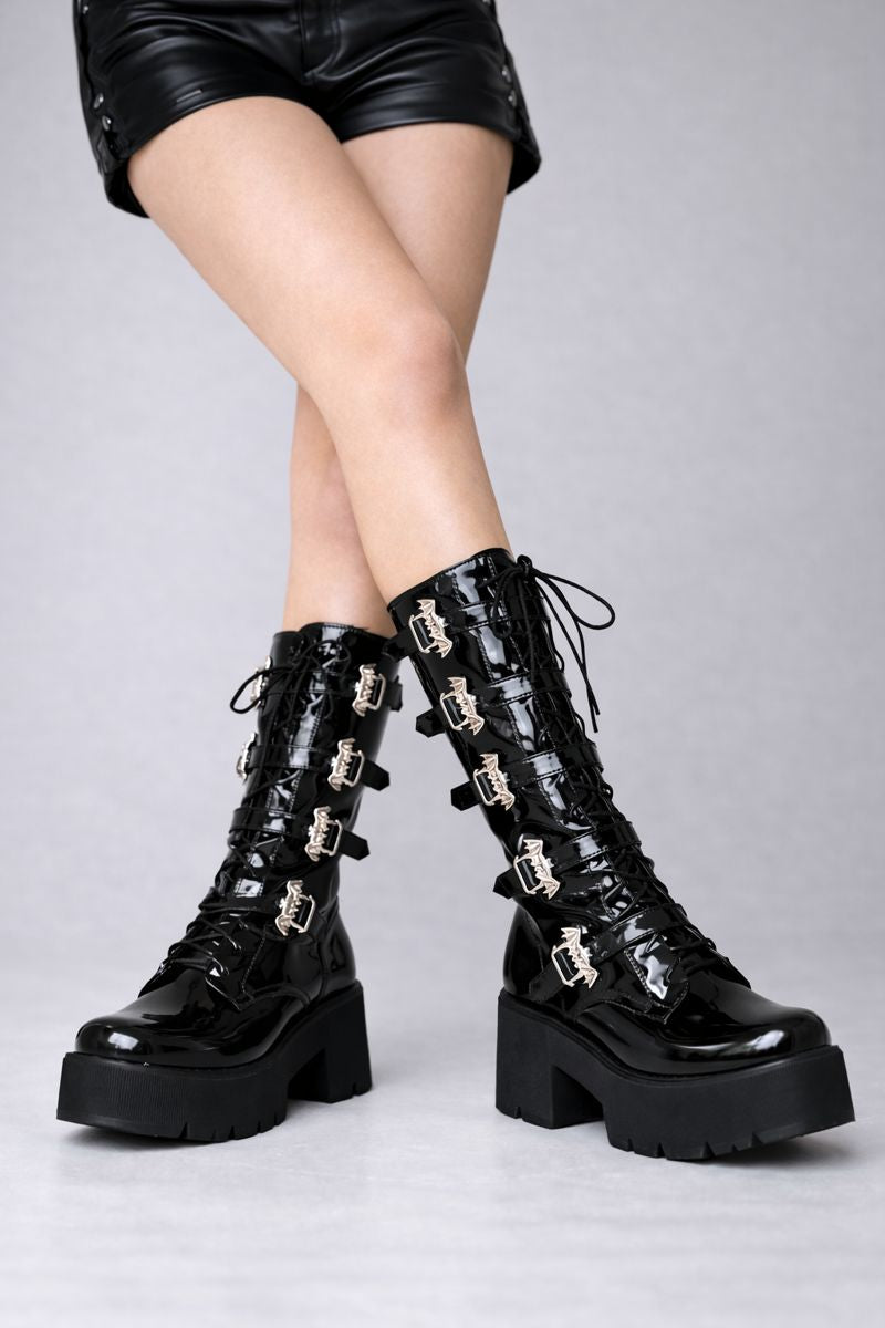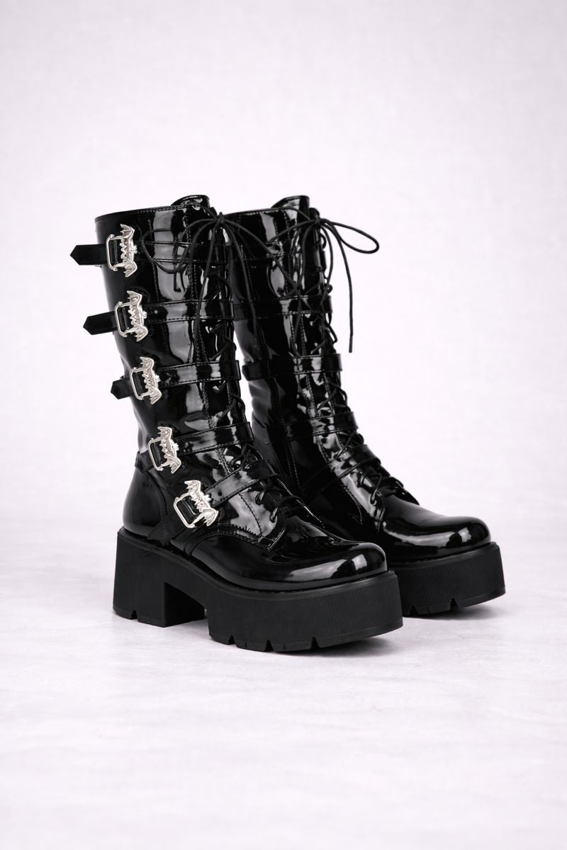 The high-shaft design features multiple buckle straps for a statement finish, balancing utility and alternative edge. Finished with a side zip for easy wear, these boots are made to elevate everyday looks while holding a powerful presence.