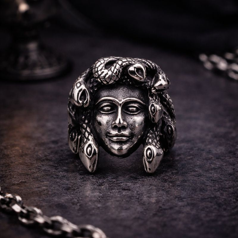 A dark symbol cast in metal. This silver ring features a sculpted medusa-inspired skull face, merging mythological power with a raw punk attitude. Intricately detailed and unapologetically bold, it’s designed to anchor the hand with presence — a statement piece made to be worn with intention.