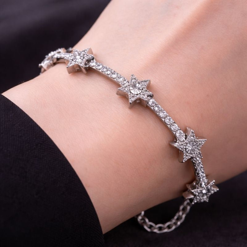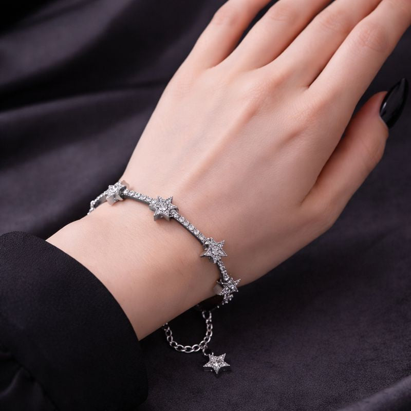 A delicate constellation wrapped around the wrist. This silver star bracelet features a sleek chain adorned with pavé-set star details, catching the light with every movement. Designed to balance softness and edge, it adds a celestial glow to dark, after-hours silhouettes.