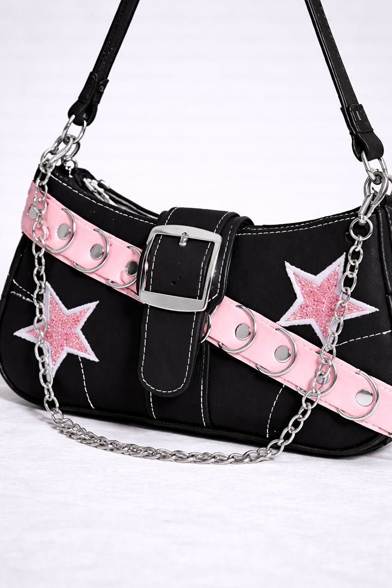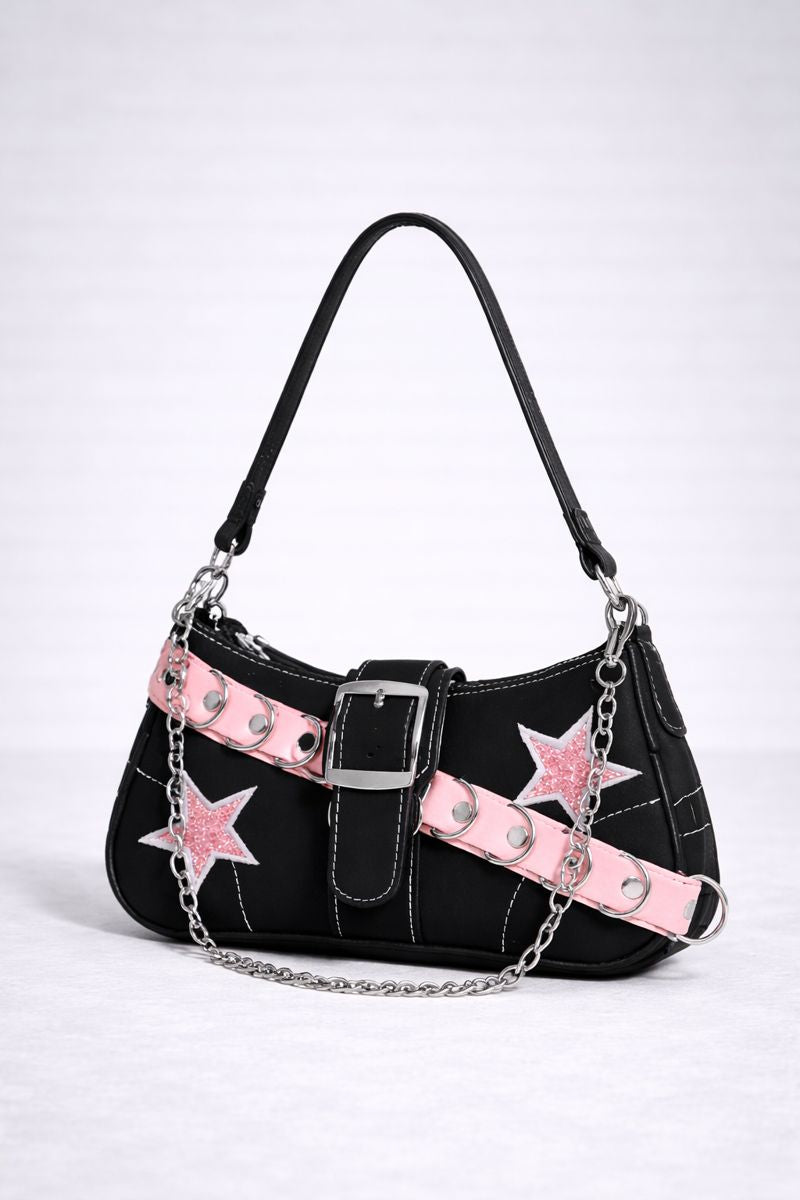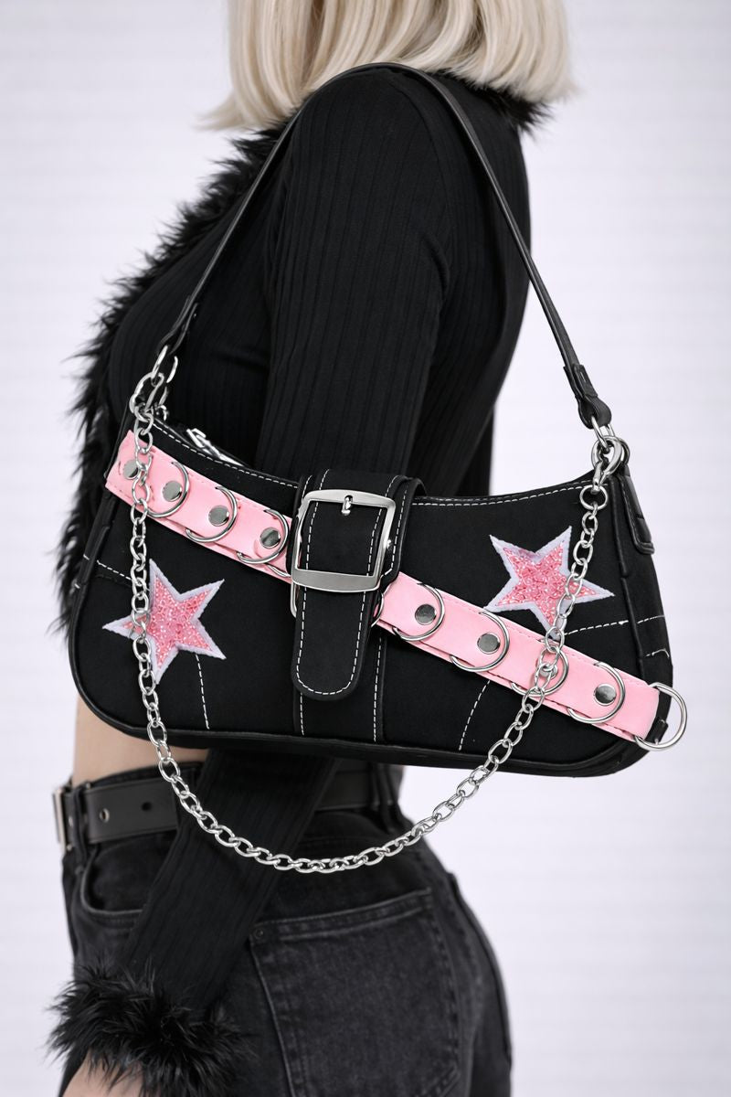 A compact shoulder bag inspired by Y2K and punk aesthetics. Designed with a sleek black base, silver chain details and pink star accents, this baguette-style bag adds a playful edge to any outfit.