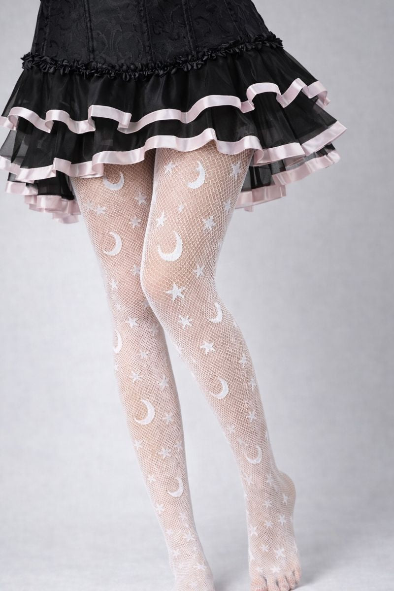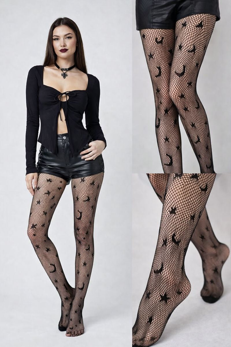 Celestial symbols meet after-dark attitude. These ultra-thin fishnet stockings are traced with stars and moons, wrapping the legs in a graphic, hypnotic pattern. Designed to elevate silhouettes from subtle to striking, they move effortlessly between softness and edge — day fading into night.