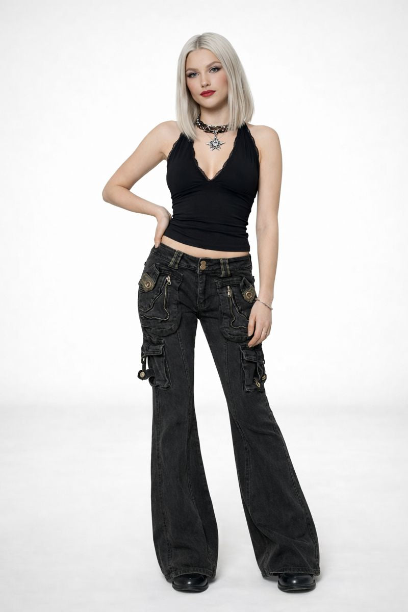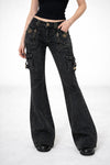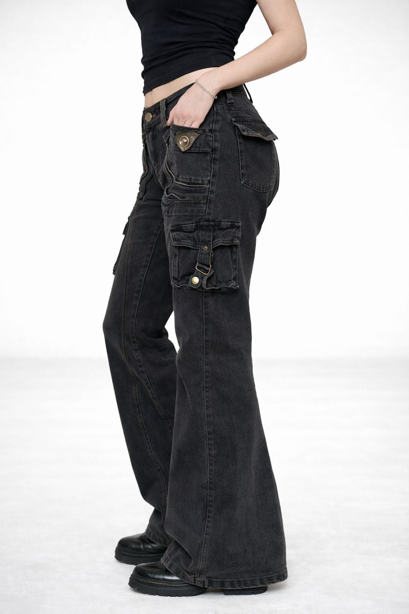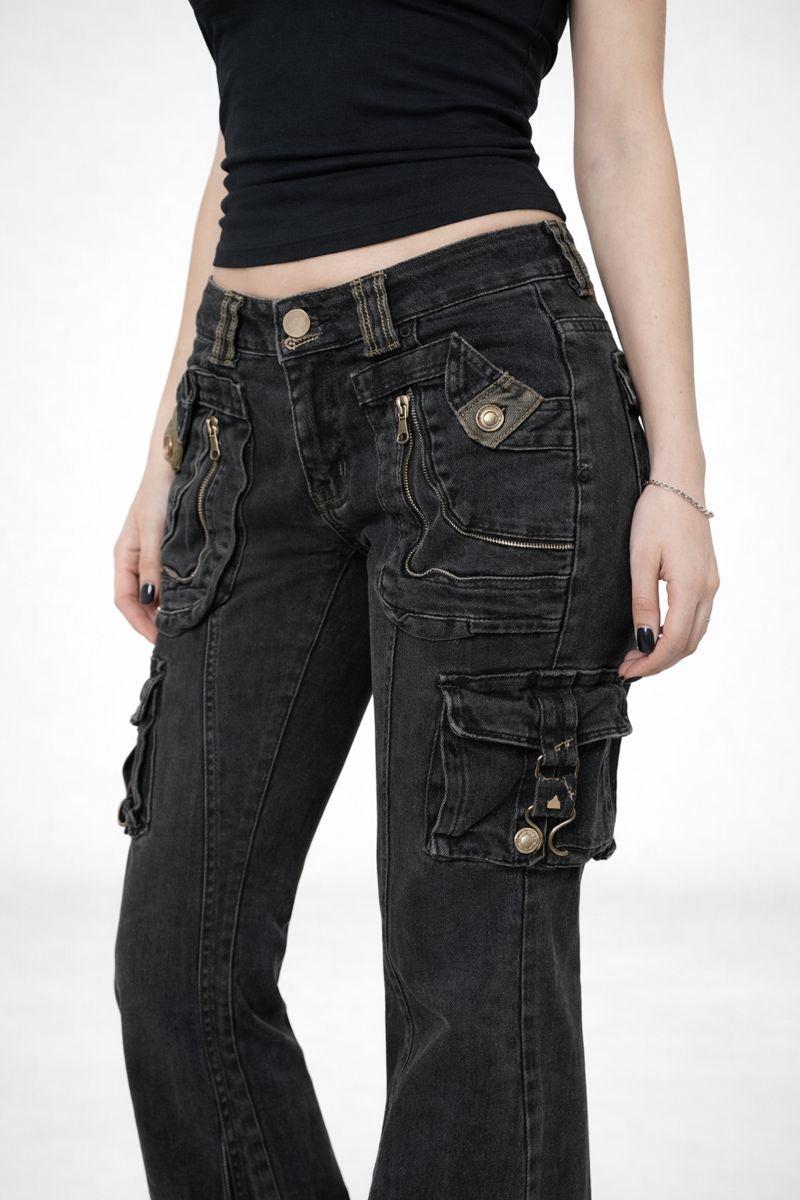 Multiple utility-style pockets and metal details bring a raw, Y2K-inspired edge, while the washed black denim finish adds depth and character. Built for everyday wear, these jeans offer a statement look without sacrificing versatility.